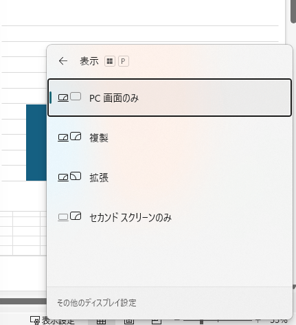詳細な設定は個人設定から行う必要がありますが、ディスプレイの複製・拡張など切り替えができるウィンドが開きます。覚えると配信で切り替え時に役立つかもしれません。